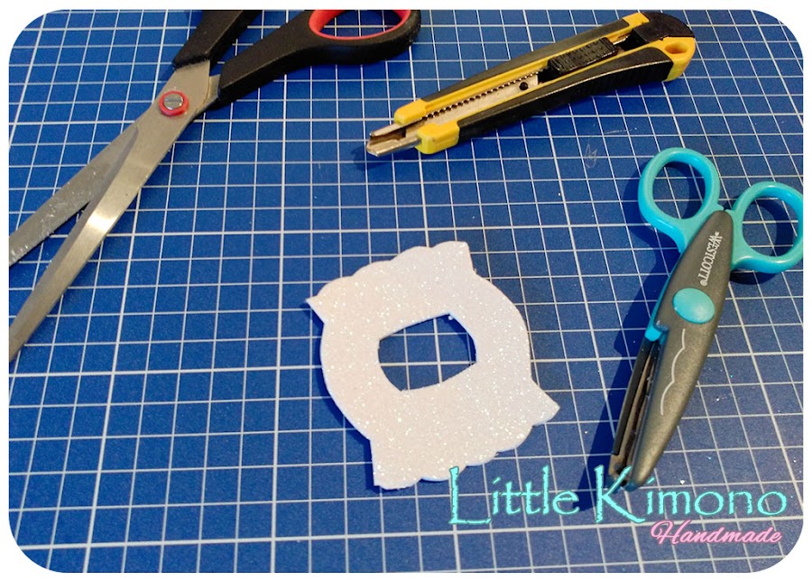 1. Descargamos la plantilla, la transferimos a la goma EVA y recortamos, para el efecto encaje del vestido podemos usar una tijera de ondas ;)