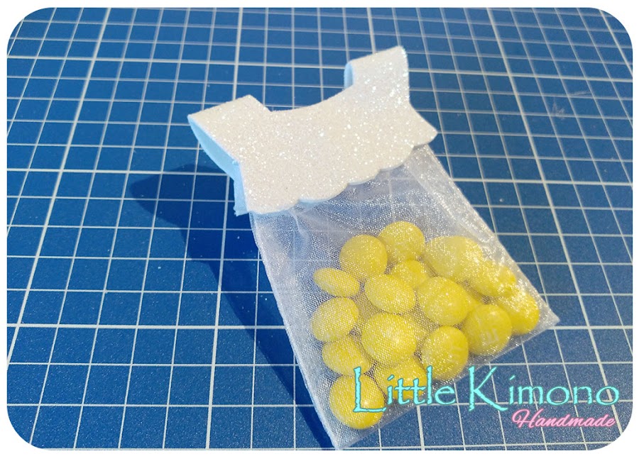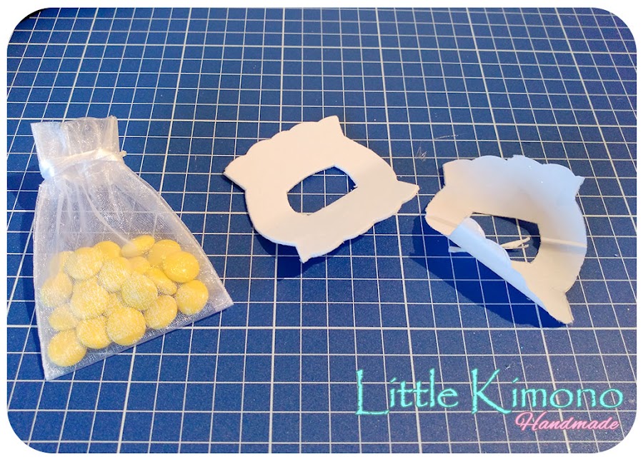 2. Rellenamos la bolsita de organza, quitamos el papel protector de la goma EVA y pegamos en la parte superior de la bolsa.