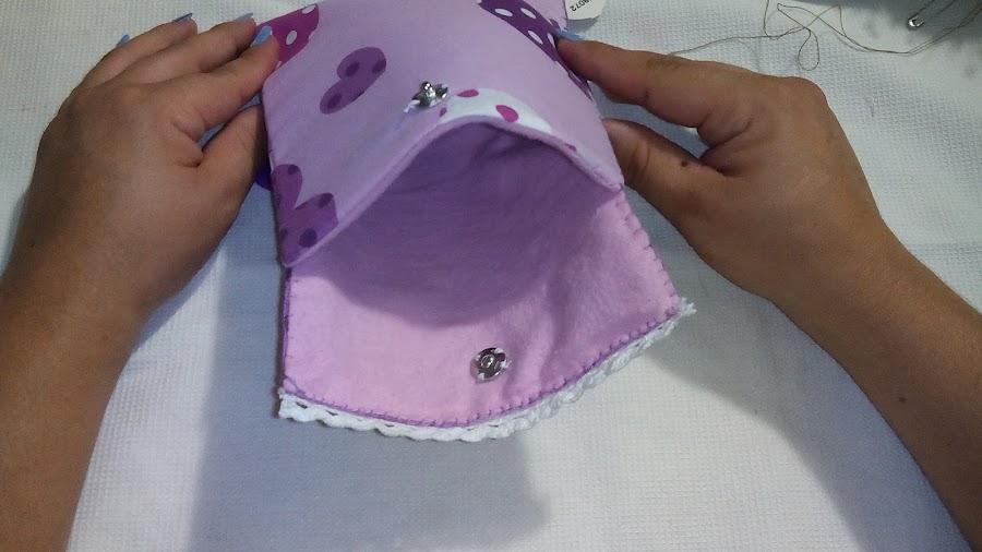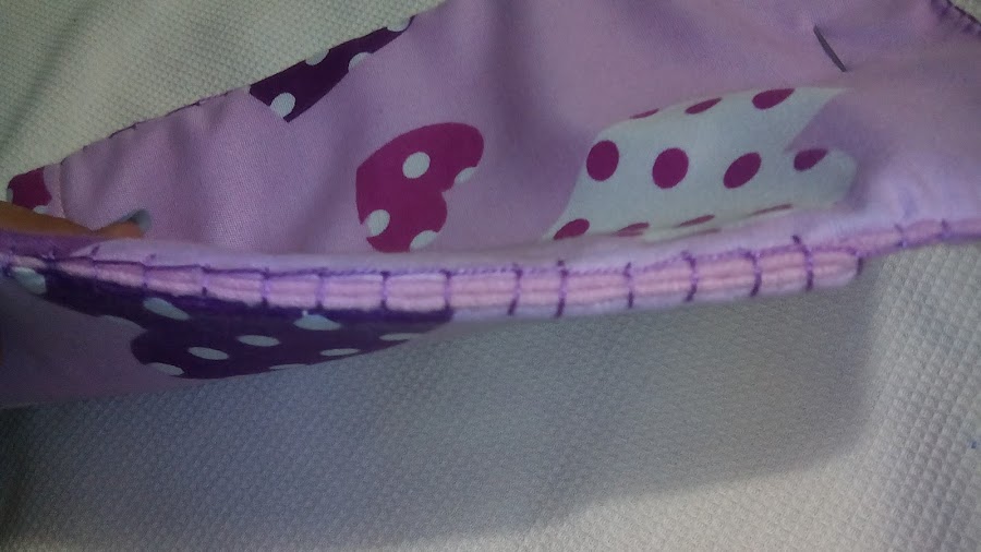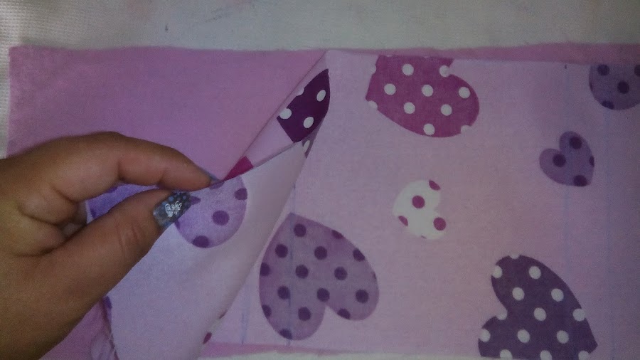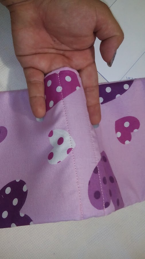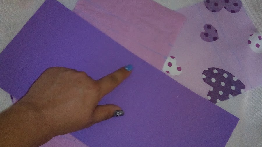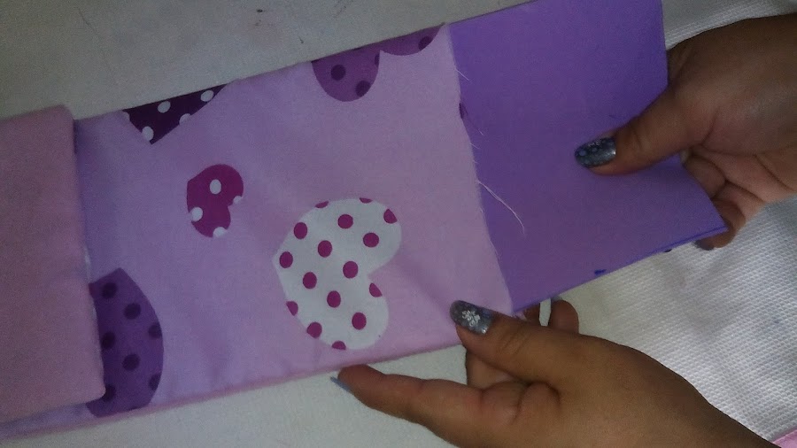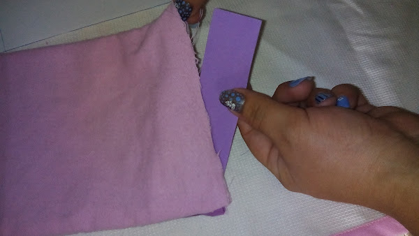 Se encaran las telas por la parte del derecho2. Una vez cosido, damos la vuelta y metemos el foami, que tendrás que cortar y adaptar para que entre en el "saquito" que nos quedó una vez que cosimos las telas. Al foami, le debes cortar un trozo de unos 5cm de ancho, que hará las veces de solapa, de esta forma: