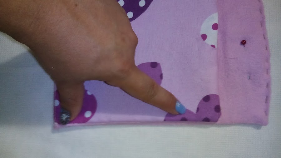 1. Se cortan las telas, se encaran los lados del derecho y se le pasa una costura por todo el borde, dejando un extremo sin coser porque se necesita para darle la vuelta a la bolsita