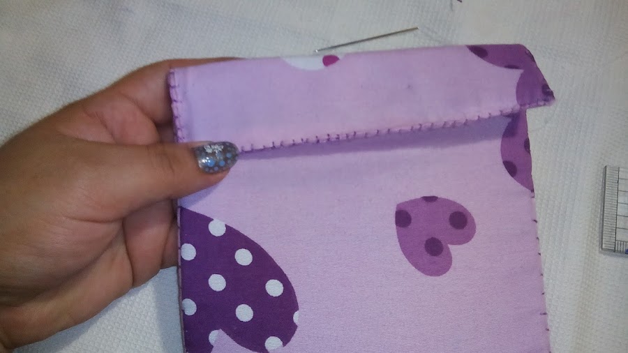 9. Cosemos todo alrededor, incluida la solapa como puedes ver. Intenta hacer las puntadas todas a la misma altura y distancia para que se vea más bonito...