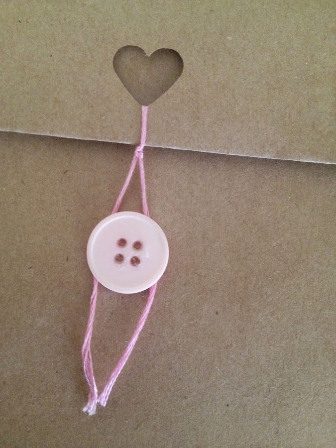 Luego, pasamos un hilo de bordar o cinta bebe por el coraconcito y así cerramos nuestra bolsita.