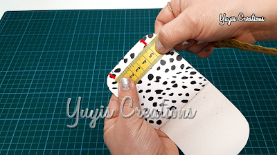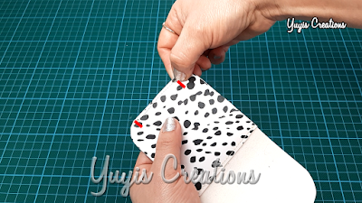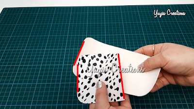 Cortamos la polipiel usando este patrón. Usaremos 1 pieza de cada uno. Luego vamos a marcar las piezas para empezar a coser. Colocamos entonces una pieza sobre otra y marcamos en el centro 5 cm, así como ves en la imagen de abajo. Esto lo hacemos en ambas piezas.