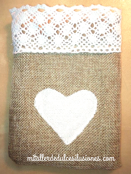 2. Lo primero es que decidáis de que tamaño las necesitáis,yo he hecho tamaños,la de corazón mide 17 cm de alto x 13 cm de ancho,la del lacito es unos cm más pequeña 15 cm x 13 cm .Cortáis vuestras tiras de arpillería para montar las bolsitas.Procurar con unos alfileres sujetar las zonas por donde váis a coser,ya sea para hacerlo a mano o a máquina.