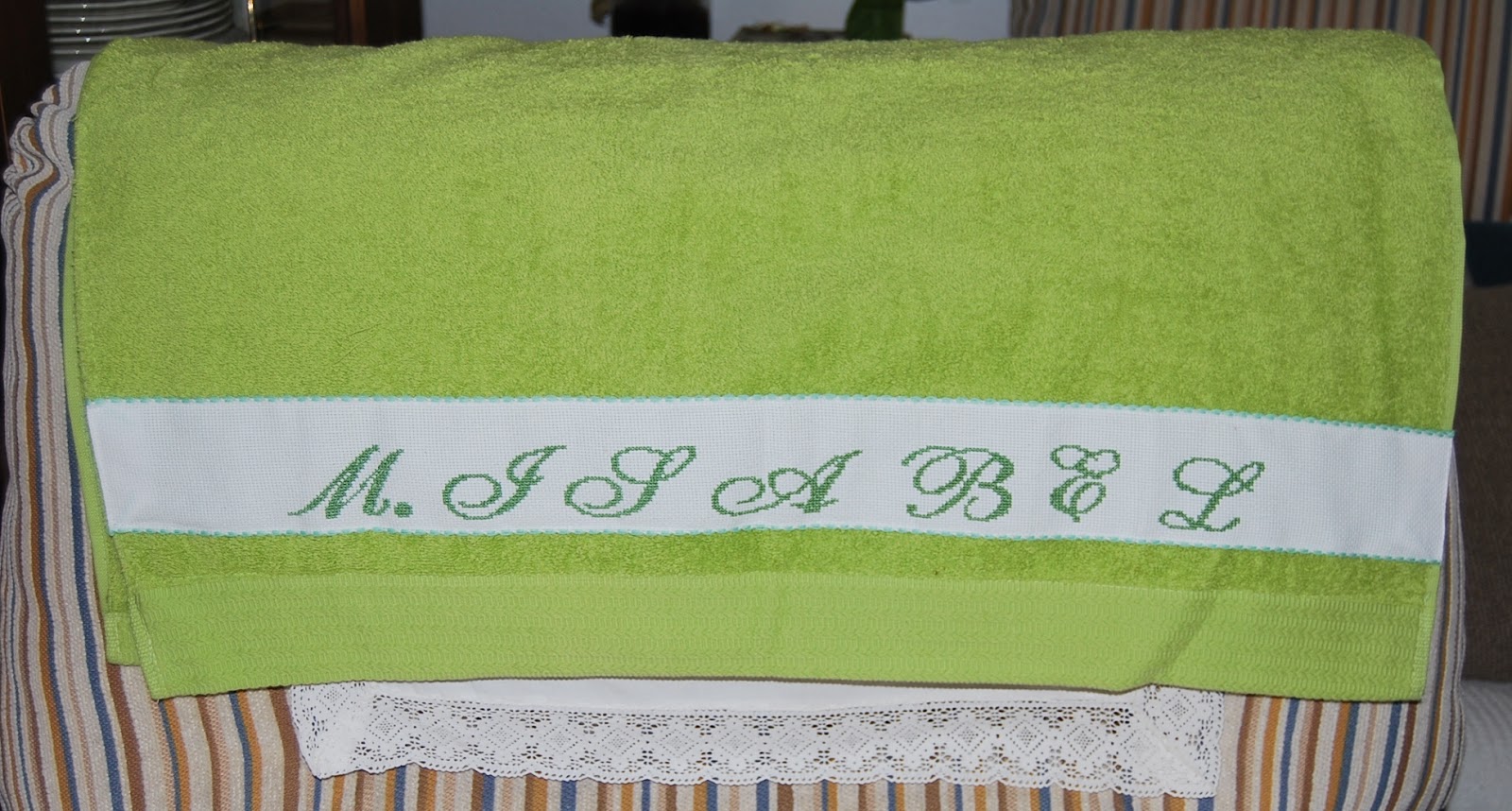 Para empezar, encima de la cama de la habitación en la que iba a dormir, me encontré esta toalla personalizada preciosa, que me emocionó, porque me imagino el "trabajo" que le ha debido costar bordármela...