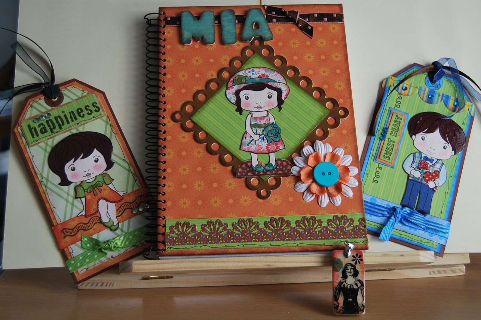 la encantadora Esme, con todo el lío que tenía con sus clases y demás cosas añadidas, tuvo tiempo de hacerme esta preciosa libreta con su sello inconfundible, unos tags con unos niños magníficamente coloreados y un colgante de una ficha de dominó, estampada y embosada con Ute...
