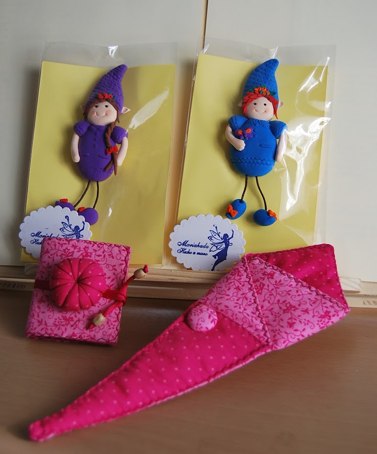María también quiso agasajarme con estos preciosos broches hechos por ella, uno para mi hija y otro para mi, y un guardatijeras y un guardaagujas con acerico precioso...