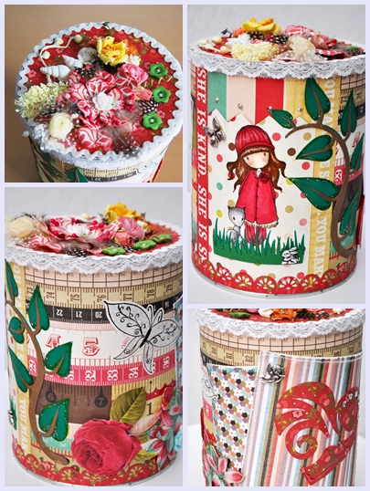 Y ya en la quedada scrapera que habían organizado para el Sábado 7/Julio/2012, la anfitriona, Sandra, aún con el poco tiempo que le queda después de sus clases, su casa y ser super-mamá, me tenía preparada esta preciosa lata con una muñequita Gorjus y perfectamente decorada, como nuestra maestra que es...