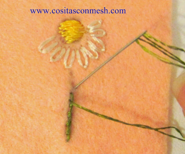 4.-Ahora para hacer el tallo de la flor, usare hilo doble verde, la puntada que use es la de punto atrás, también podemos usar cadenita u otras.El tallo de la flor tendrá hojitas pequeñas, las cuales hice con puntada margarita.