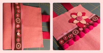Recortamos 2 tiras en fieltro de otro color, y aseguramos con alfileres, del lado del revés del rectángulo, como vemos en la imagen.