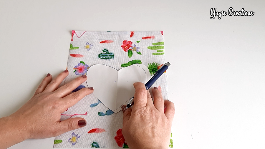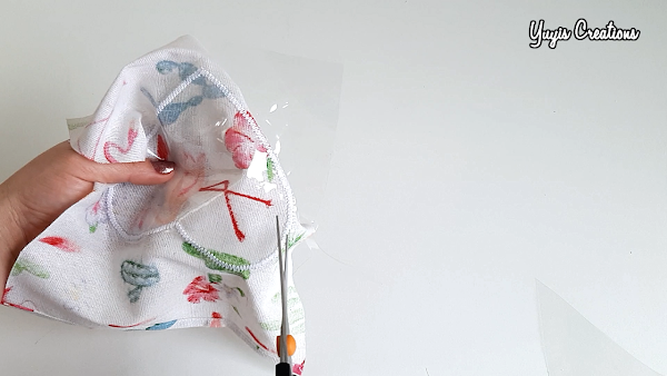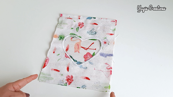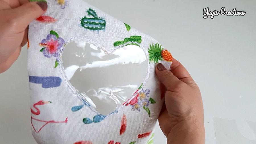 Con cuidado cortamos el sobrante de hule a ras de la costura y extraemos también la tela del corazón, también a ras de la costura, de esta forma: