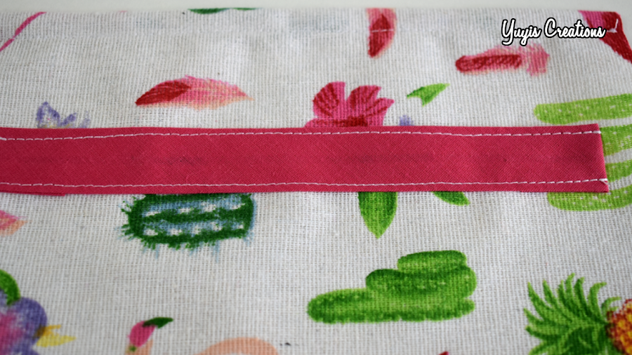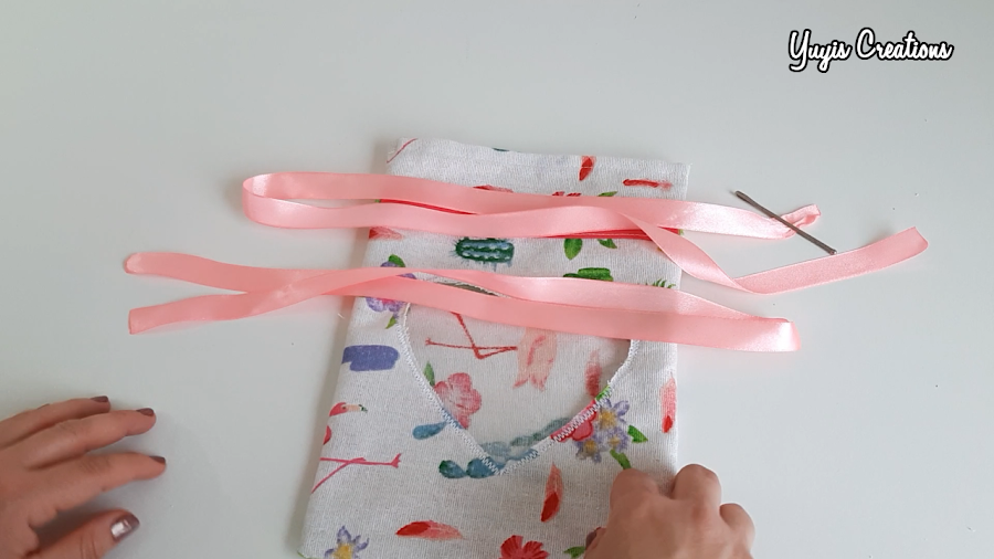 Cosemos las cintas bies en ambas piezas de tela a 4 cm del borde superior y a 1,5 cm de lo lados, solamente por los lados más largos, así: