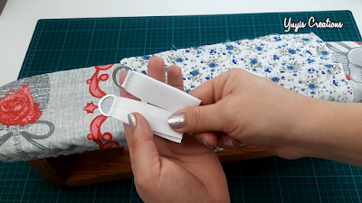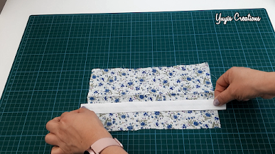 Ahora tomamos la tela de algodón y la doblamos a la mitad a lo largo de manera que nos quede una medida de 8x24 cm. Planchamos para hacer una marca, abrimos la pieza de tela y a 2 cm de la marca central que le hicimos con la plancha, vamos a ubicar la cinta bies.