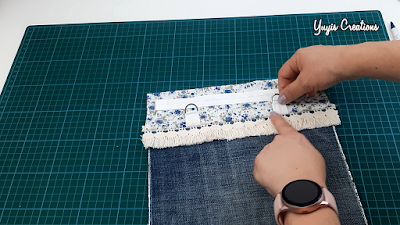 Ahora cosemos el material aislante en nuestra tela de jeans, de forma que el derecho de la tela quede a la vista.