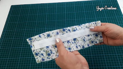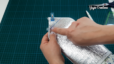 Me gustaría aclarar que en el vídeo yo pongo la cinta a ambos lados de la marca que hicimos con la plancha pero esto no es necesario. Esto fue un error que no me di cuenta que cometí hasta que la bolsita estuvo terminada, pido una disculpa por eso. Sin embargo no supone ningún trastorno al momento de hacer la bolsita térmica, simplemente el bies de la parte de dentro no tiene ninguna función.