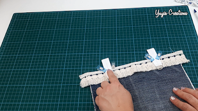 Por uno de los lados de 24 cm ponemos la tira de flecos y cosemos con un zigzag, luego ubicamos nuestros colgadores así como ves en la foto de abajo y los aseguramos con unas puntaditas.