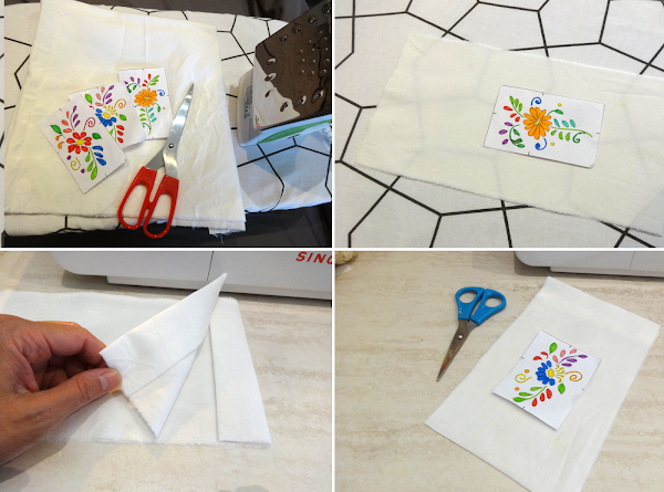 Básicamente he tomado varios diseños de flores de vestidos, los he copiado a una medida que se pudieran adaptar a la dimensión del bolsito, la tela que he utilizado es algodón. He cosido el borde superior para poder encontrar el centro del bolso y ubicar el diseño