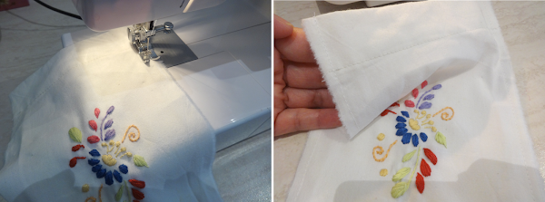 Terminado el bordado he realizado el siguiente proceso: por la parte del derecho y lo más cercano al borde coso, este proceso lo hago ya que no cuento con una máquina de coser sobre-hiladora