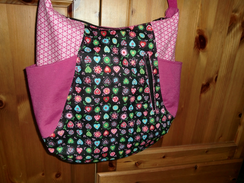 Las telas estampadas son de patchwork y la fucsia es loneta, todas son de Telas Pedro. Los enganches metálicos del asa (¿piquetes?) y la pieza que hace que el tirante sea regulable son, como siempre, de Lasa.