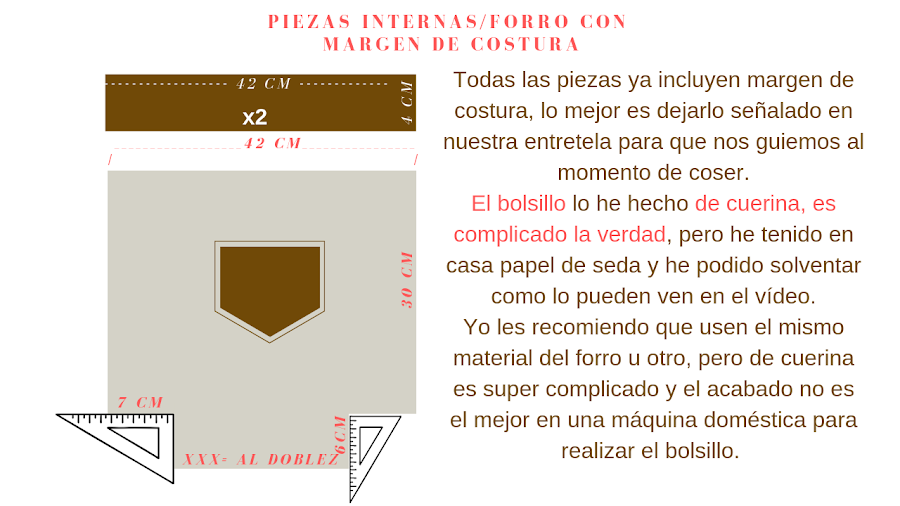 Hemos colocado cinta de mochila (morral) en las asas y en la parte superior, todo esto es por el material que es complicado de manejar, si llegas a conseguir otro material que se maneje perfectamente por el derecho puedes pasar un pespunte en lugar de colocarle la cinta en la parte superior, por otro lado para poder colocarle el bolsillo que también lo hice de cuerina utilice papel de seda para poder pasar el pespunte, el bolsillo esta cortado lo mas parejo posible, no se cosieron los bordes antes de colocarlo, por el mismo tema que es un material complicado de manejar, es por ello que debes cortador lo mas parejo posible para que tenga buen aspecto.