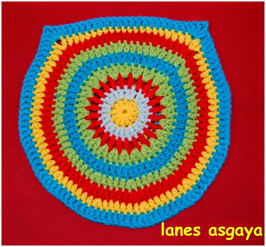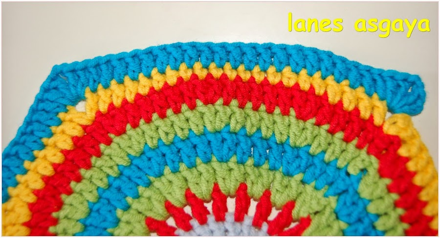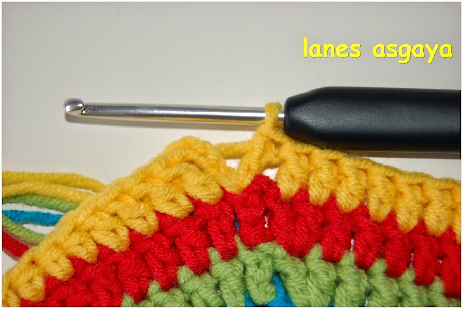 Usaremos puntos altos, medios puntos altos y puntos bajos. Cada punto alto inicial se sustituye por 3 cadenetas. Y en cada vuelta cambiamos de color. Recordad que picando en las fotos podéis verlas más ampliadas.