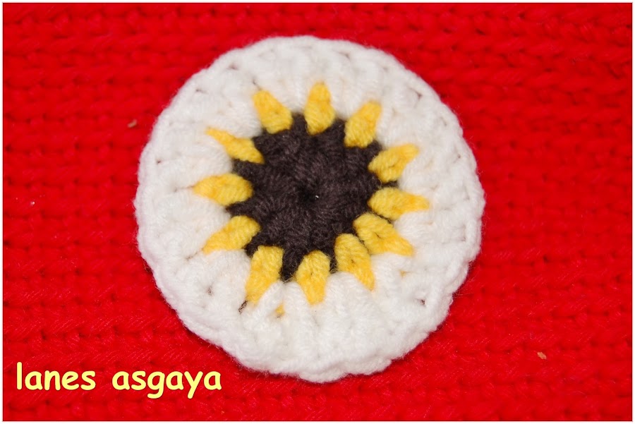 1 aumento (2 p. bajos en el primer punto), 1 p. bajo en cada punto, hasta el último punto, en el que haremos otro aumento (2 p. bajos en el mismo punto) (27 puntos)