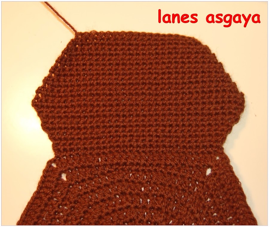 Y ahora tejeremos la solapa en pasadas de ida y vuelta con puntos bajos, sobre los 25 puntos que tenemos en la parte recta, entre los 2 grupos de 2 cadenetas. Empezaremos haciendo vueltas de aumentos, para después hacer las vueltas de disminuciones, siempre en las vueltas de derecho, en las vueltas pares haremos siempre un punto bajo en cada punto.