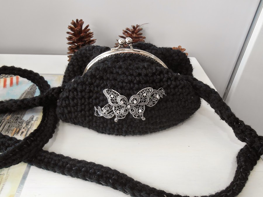 Le tejí con una larga tira para llevarlo de lado, como es lana y para que no diera de sí