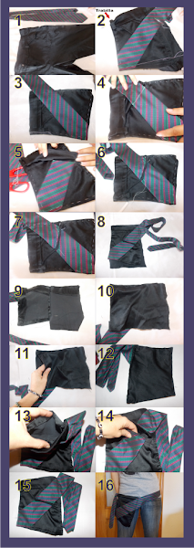 PASO 2: Ya tenemos nuestro bolsillo, ahora colocaremos la corbata como nos guste, teniendo en cuenta lo que necesitan para rodear vuestra cintura. A medida que vamos avanzando ir punteando con hilo para que vayan viendo como va quedando, para fijar la corbata, y teniendo la posibilidad de hacer cualquier ajuste porque aún no hemos hecho la costura final.
