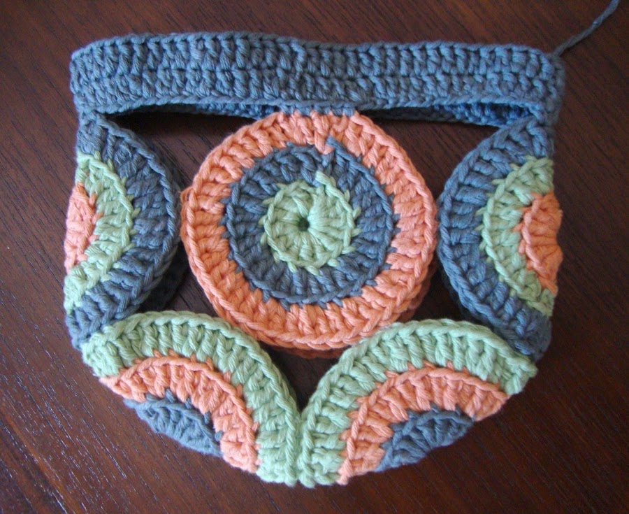 Por arriba cierro los 4 círculos con 14 cadenetas al aire fijadas sobre el borde superior de los círculos con 5 puntos bajos alante y atrás y 4 en los de los laterales.