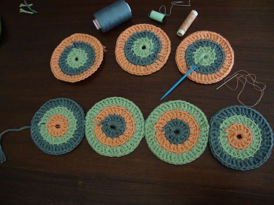Necesitaremos 6 círculos iguales a los de la camiseta, emparejados por colores de 2 en 2 y un séptimo que ampliaremos para hacer la tapa.