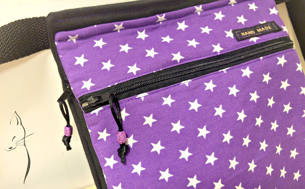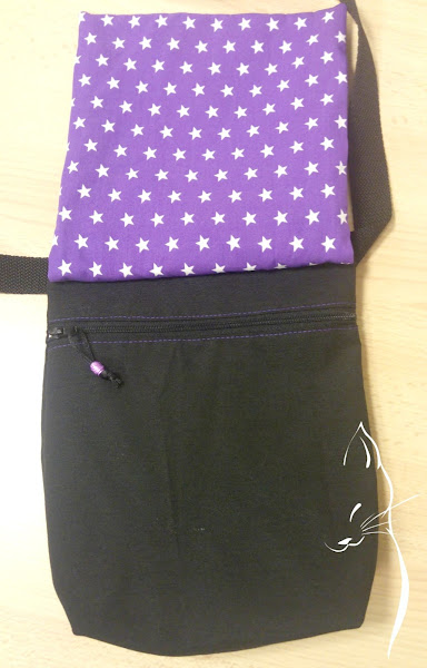 Con tela morada de estrellitas combinada con loneta negra, ambas de Cal Joan.