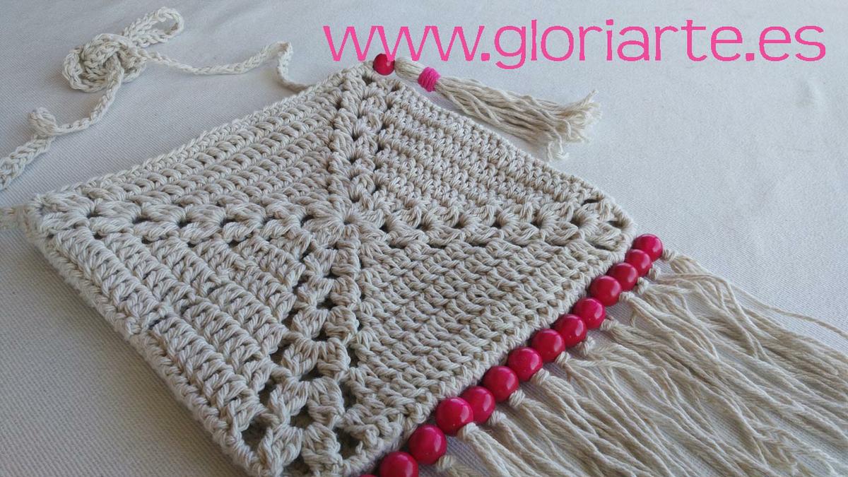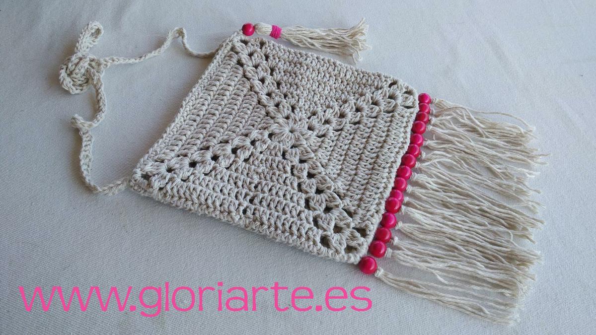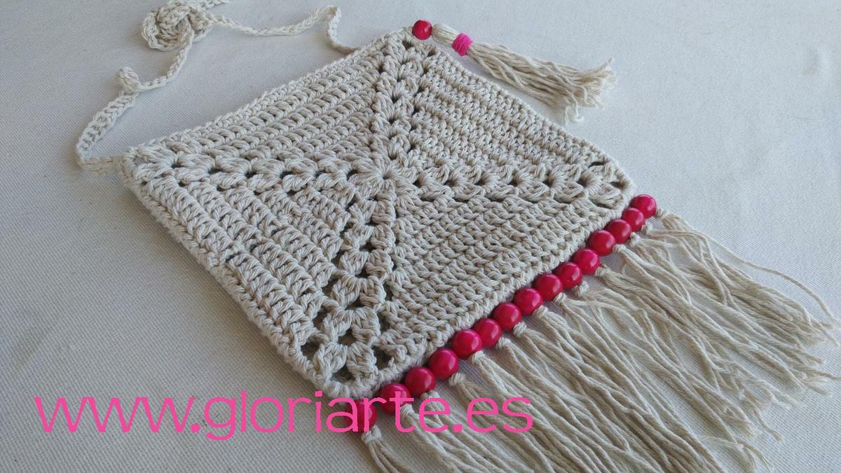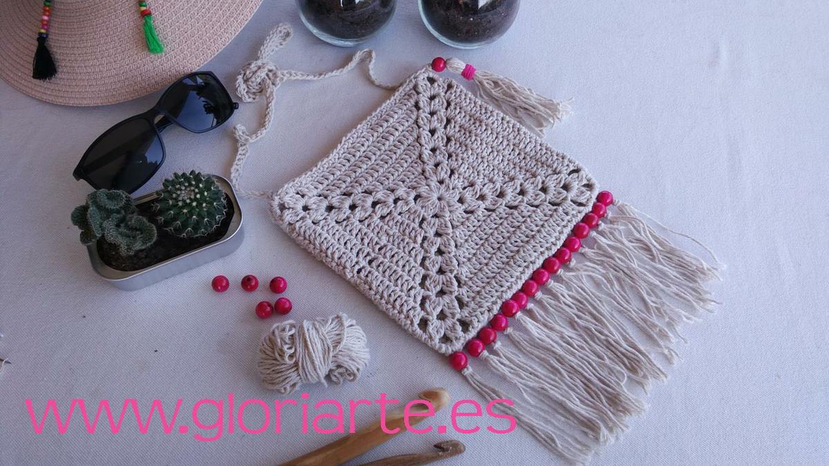 A partir de 2 grannies de crochet, o cuadrados de ganchillo, vamos a realizar este bonito y sencillo bolso de estilo boho con flecos y cuentas de madera.