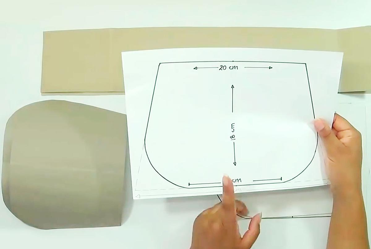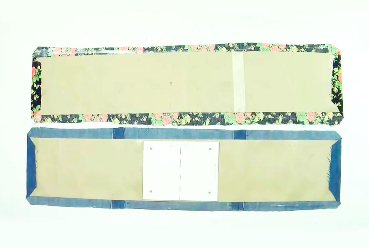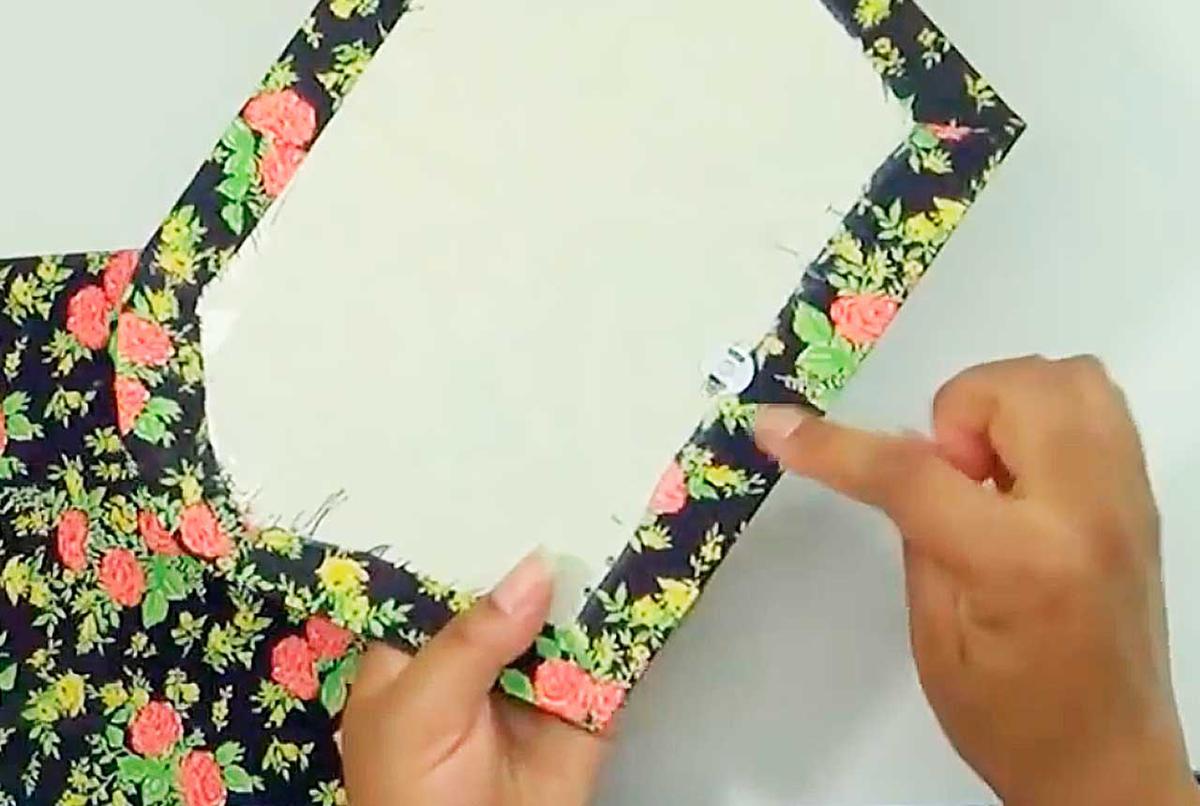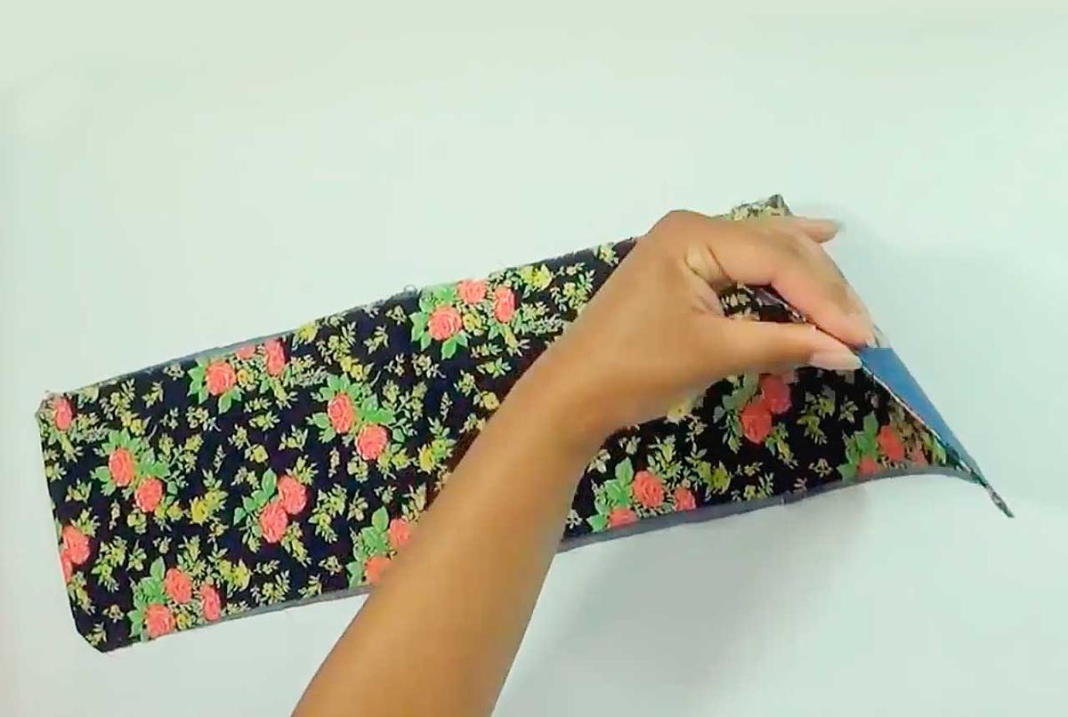 Unir la otra pieza larga a la tela que será el interior del bolso y cubrir los laterales más cortos.