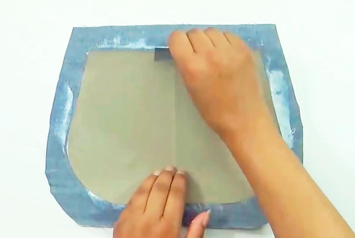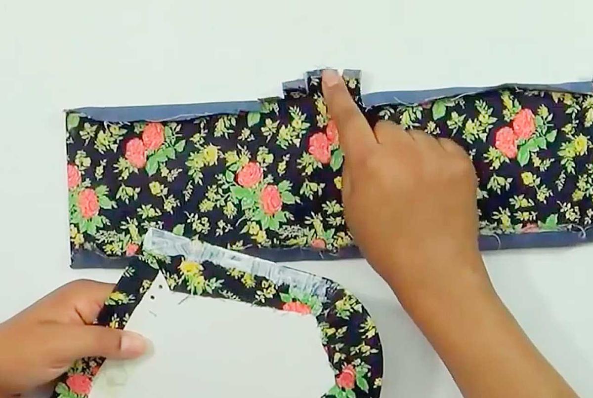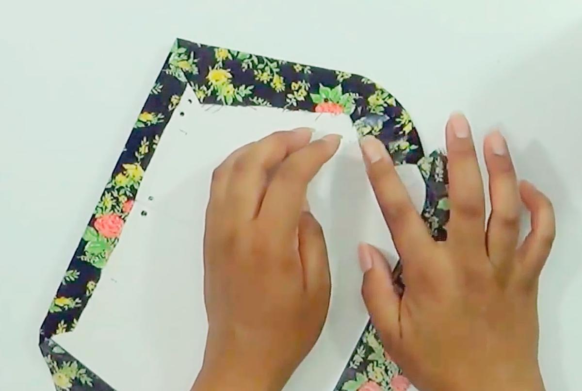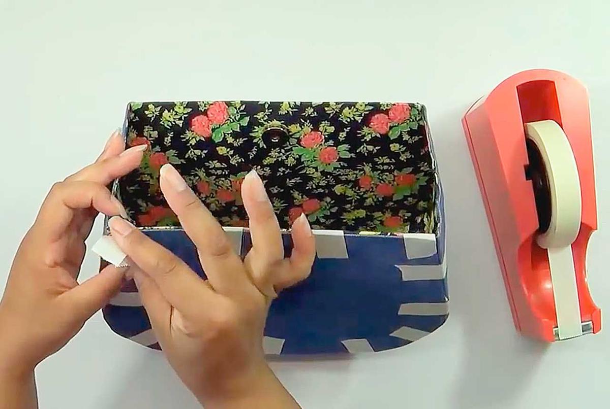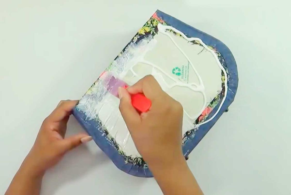 Primero pega el borde superior, luego los laterales, y para que vaya tomando la forma circular, hacer cortes en la tela sin llegar al cartón.
