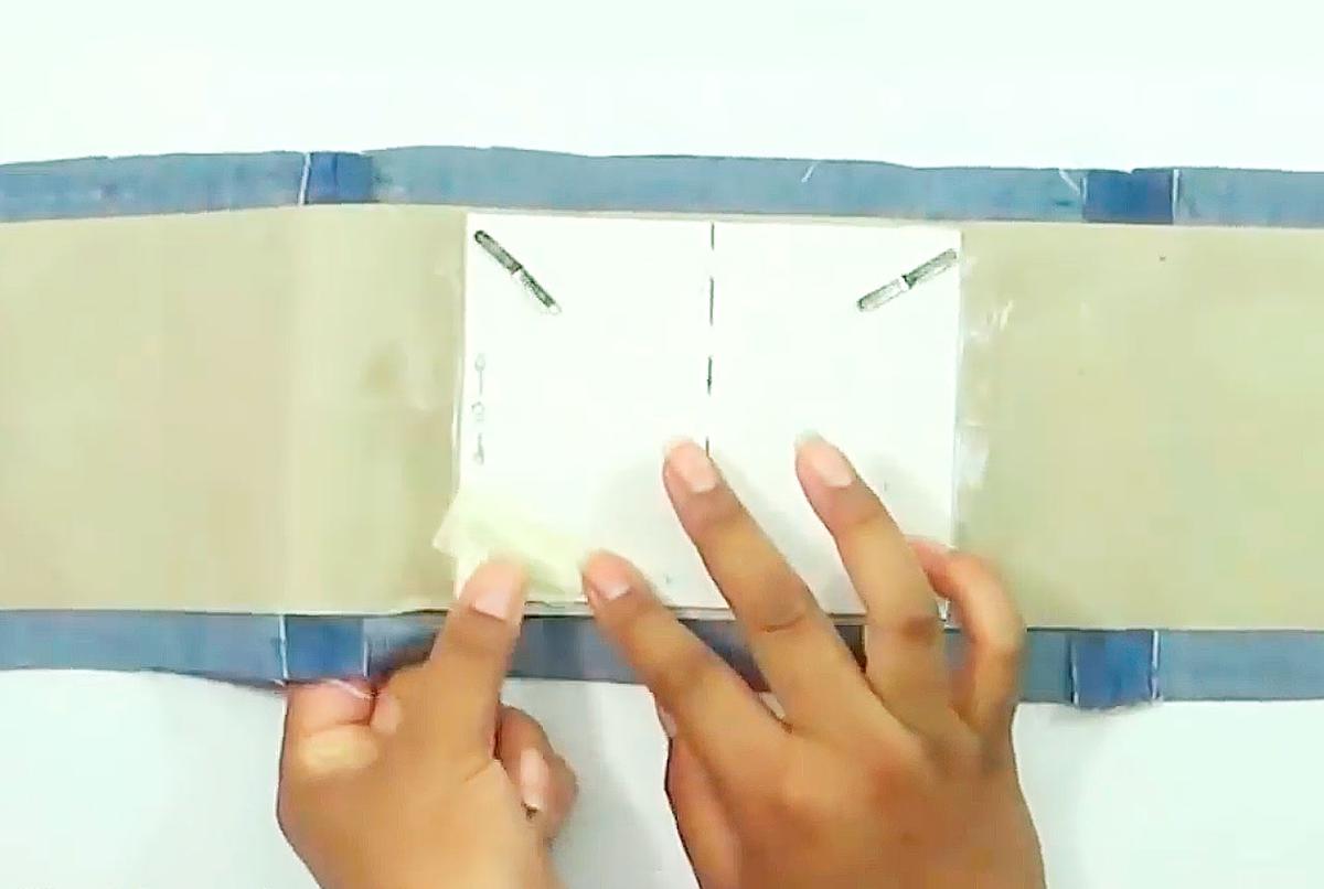 Colocar las piezas del cierre del bolso en las piezas de cartón piedra forradas con la tela interior.