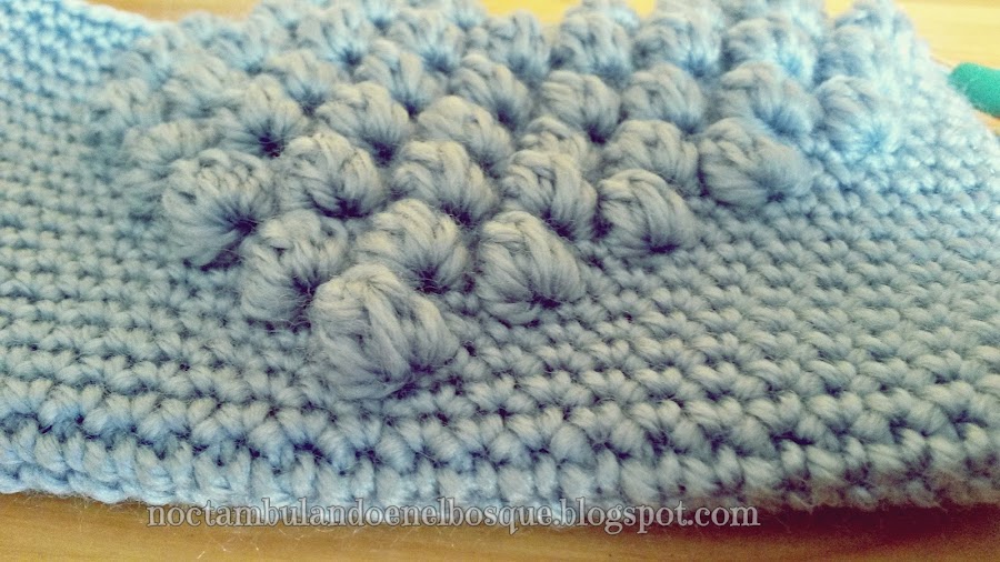 - En la vuelta 7 vamos a tejer 12 pb, 1 punto bobble, 1 pb, 1 punto bobble, 1 pb, 1 punto bobble, y seguimos hasta el final de la vuelta haciendo puntos bajos.