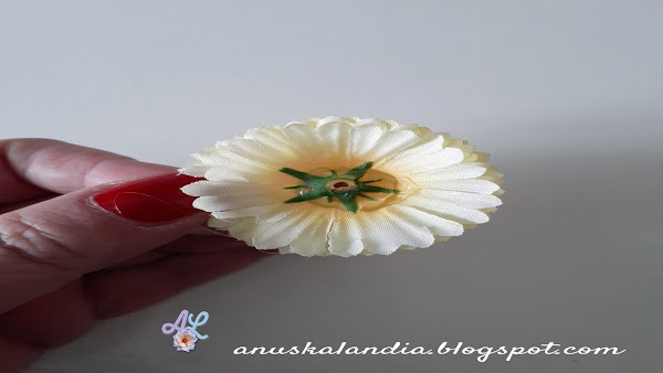 6.- Vamos a ponerle un toque decorativo al bolso de mano, en este caso una flor. Esta vez no está hecha por mi, no me ha dado tiempo, ni tenía aún material para hacerla. Ponemos silicona en la parte trasera. Pegamos en un lateral o en el lugar de tu elección.