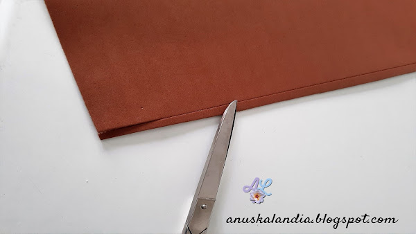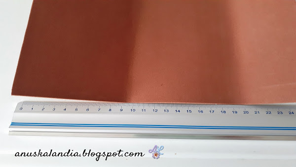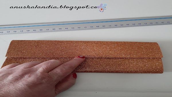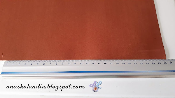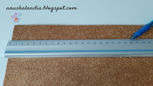 1.- Cortar un trozo de goma eva de la siguiente medida: 20 cm. de ancho x 26 cm. de alto. Marcamos con el palito de brocheta. Cortamos.