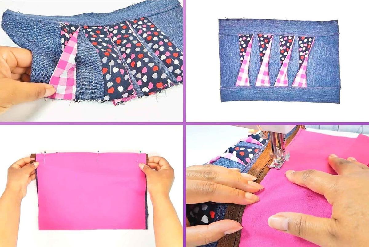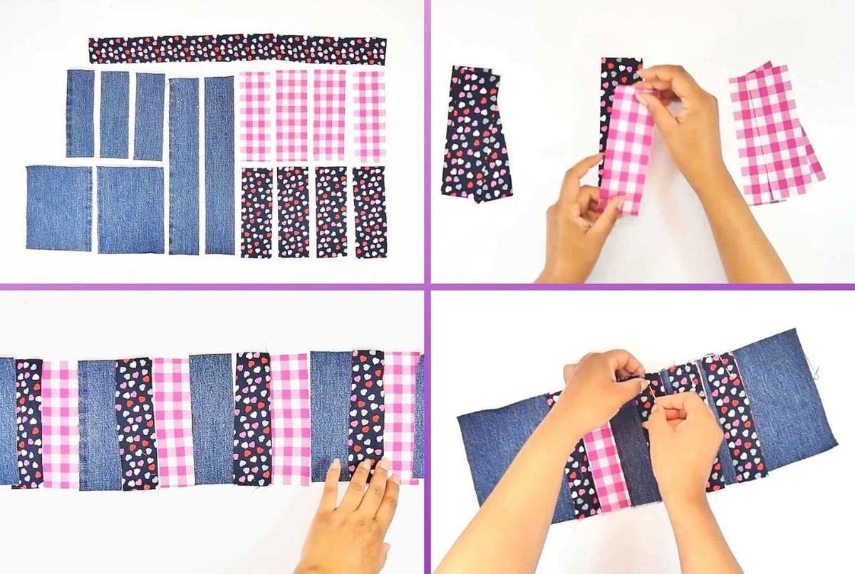 Para terminar la secuencia, coser a cada extremo las piezas de jeans más anchas (12 x 15 cm)