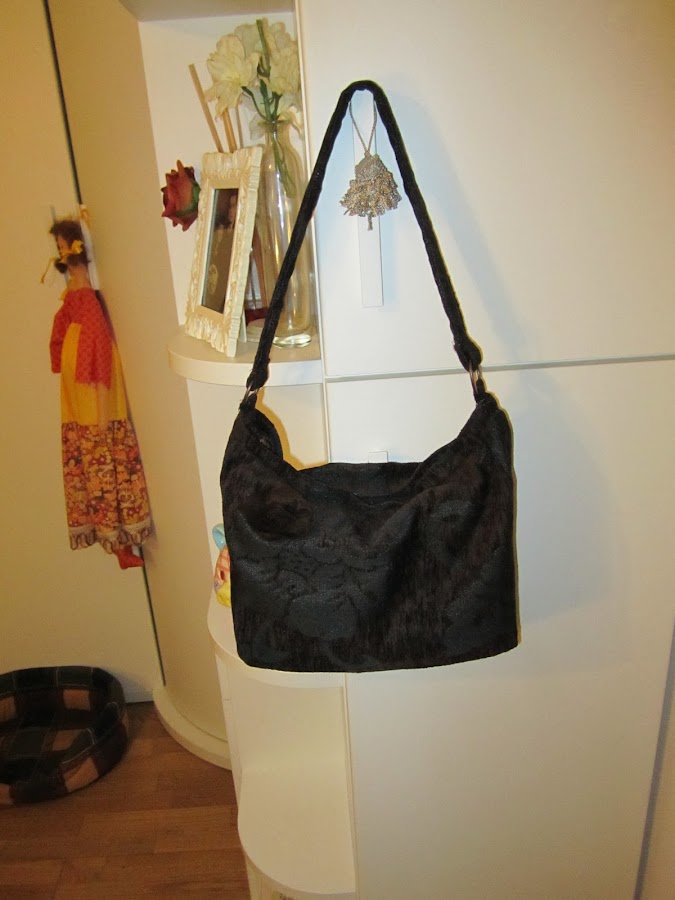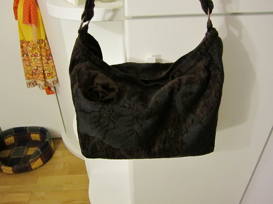 El patron es el mismo de siempre, solo lo he puesto mas cortito, manteniendo el mismo ancho, y en lugar de dos asas le he puesto una, sujeta al bolso con dos anillas metalicas de color bronce. La flor esta hecha con la misma tela del bolso.