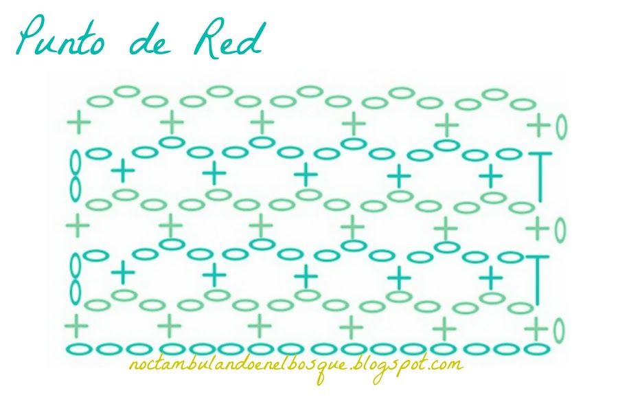 ***Tened en cuenta que el gráfico es una muestra de tejido de punto de red recto, pero como estamos tejiendo en espiral es más sencillo porque nos ahorramos los puntos de subida.
