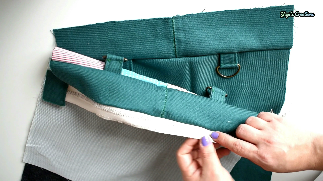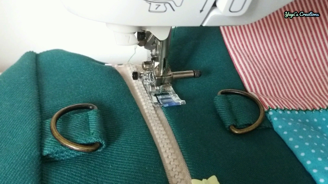 Luego de esto puse la cremallera y justo encima una pieza de forro y cosí apartando un poco la cremallera al inicio y al final, de esta manera logramos que la cremallera quede suelta y además se nos hace más fácil al momento de coser los laterales del bolso.