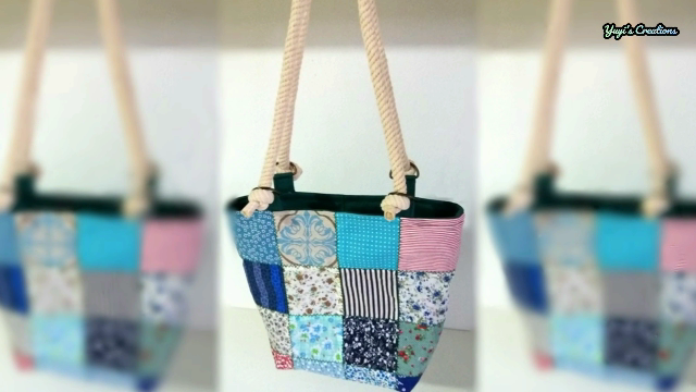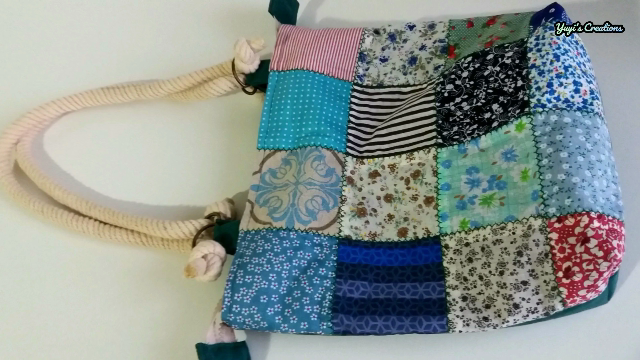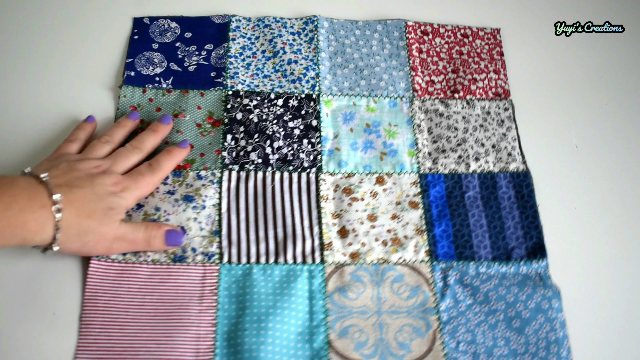 Las medidas de cada retalito para la cara delantera del bolso miden 10x10 cm, yo voy a usar 16 piezas. Estas piezas las he unido a 1 cm de costura hasta formar una sola pieza de 35x35 cm. También le he pasado una puntada decorativa por las uniones y ha quedado de esta manera: