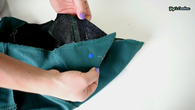 Ahora juntamos las piezas del forro por un lado y las piezas del exterior por el otro y cosemos todo alrededor apartando un poco la cremallera para que no nos moleste y dejando en el forro un espacio abierto para luego darle la vuelta.