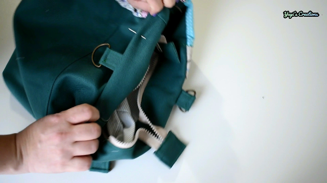 Colocamos ahora el forro dentro del bolso y bajamos la pieza de la cremallera asegurando con alfileres, y cosemos todo alrededor, así: