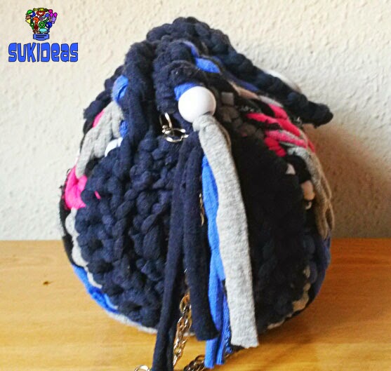 Se trata de un bolso hecho de trapillo de forma cilíndrica, forrado por dentro.