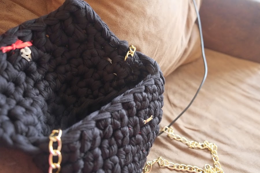 Ahora lo siguiente que hice fue coser la cadena a los lados del bolso, para hacerlo mas fácil, coge unos trozos de trapillo, mételos por la ultima anilla de cada extremo y coselas, de ese modo sera mas fácil coser la cadena al bolso.