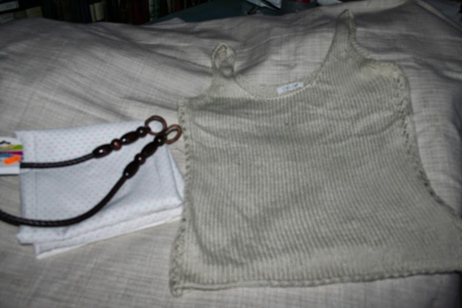 En realidad, aunque tiene forma de camiseta, es tejido de punto y, si podéis ver la etiqueta, es de una conocida cadena española de ropa. Ha sido un proyecto express porque la he "encontrado" e, inmediatamente, he dejado lo que hacía y he buscado los materiales que necesitaba para apañarme el bolsito. Como puedes ver, no son demasiados: