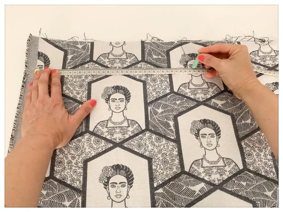Medir en la tela 30 cm de ancho, centrando el dibujo y con una tiza haremos una linea en